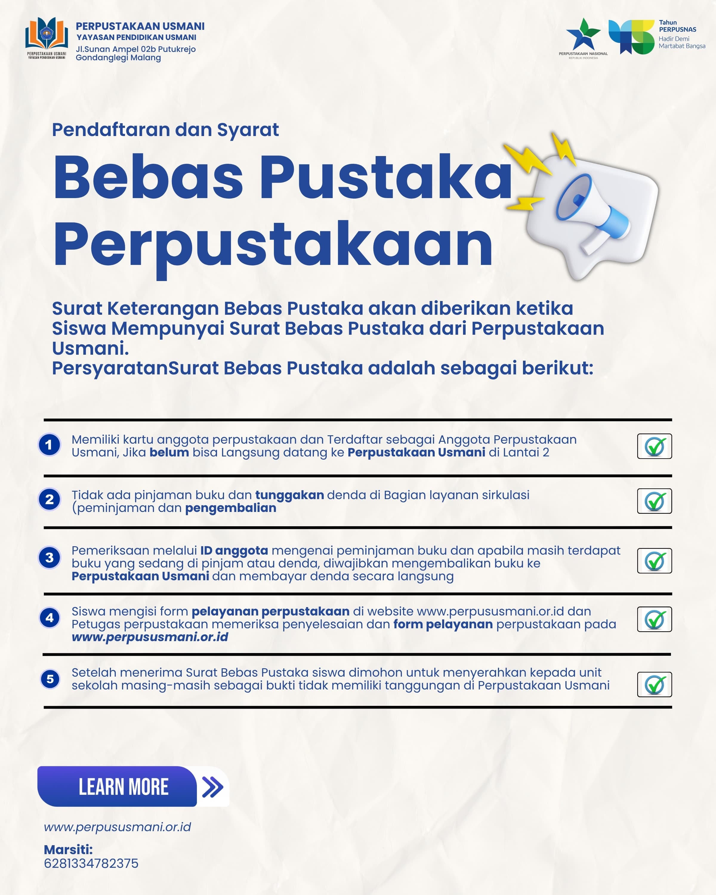 Perpustakaan Usmani hadir sebagai pusat informasi dan literasi yang menyediakan koleksi buku, jurnal, dan referensi digital dari berbagai bidang ilmu. Dengan layanan ramah, akses katalog online, serta fasilitas ruang baca yang nyaman, kami berkomitmen mendukung pembelajaran, penelitian, dan pengembangan pengetahuan bagi seluruh pengguna.